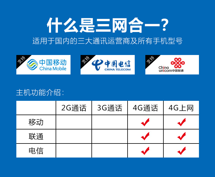 產品描述:移動聯通電信三網4G流量上網+聯通移動2G通話信號