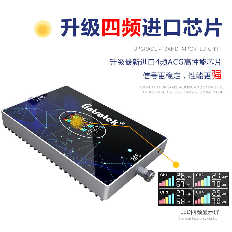 采用加厚鋁合金無縫焊接而成,可將芯片運行過程中產生的電磁輻射隔離,更有效避免外界電磁干擾,主機采用AGC技術可以使放大器的放大增益在65-82dB間變動,并可根據外界信號強弱來控制增強大小,最高的支持一拖四覆蓋500平米,讓你暢享高質量通話、上網體驗。