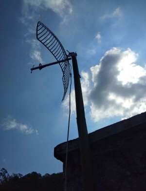 1、首先在室外或者樓頂找到空曠的位置,而且要信號相對好的方向安裝柵格天線;我們把天線用竹竿架高安裝,因為在山區地勢比較復雜,盡可能把柵格天線安裝高一點,這樣接收信號也穩定一些。