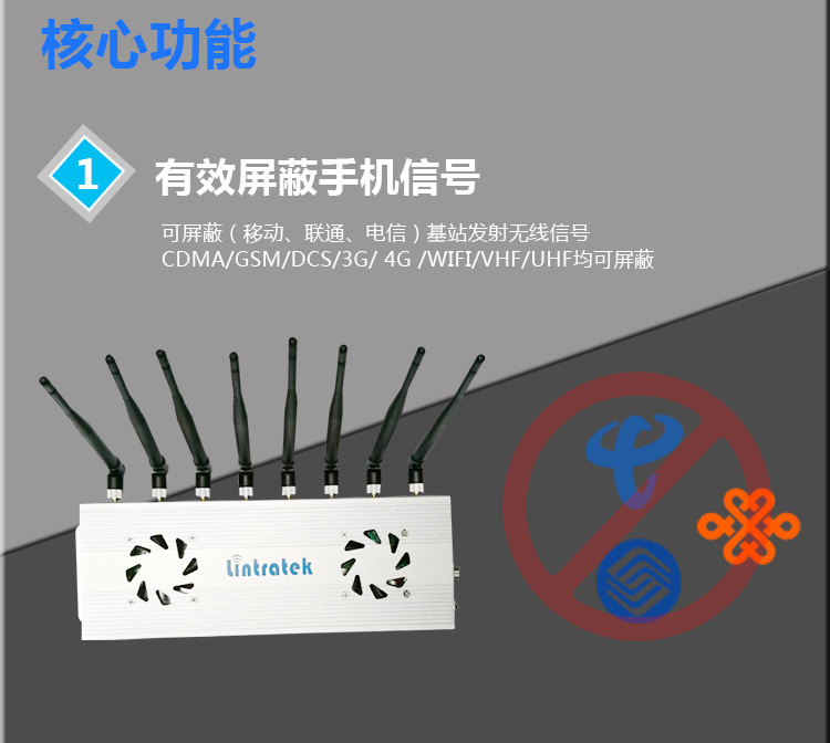 手機信號屏蔽器在工作過程中以一定的速度從前向信道的低端頻率向高端掃描,發(fā)射功率在數(shù)瓦量級,屏蔽范圍可調(diào)節(jié),一般為幾十米,手機接收信號中形成亂碼干擾,使得手機不能檢測出從基站發(fā)出的正常數(shù)據(jù),手機不能與基站建立聯(lián)接。表現(xiàn)為搜索網(wǎng)絡(luò)、手機無信號、無服務(wù)系統(tǒng)等現(xiàn)象。